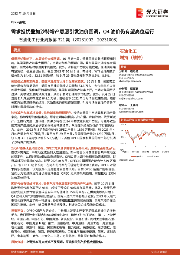 【光大证券】【20231008】20231008-光大证券-石油化工行业周报第321期:需求担忧叠加沙特增产意愿引发油价回调,Q4油价仍有望高位运行-21页