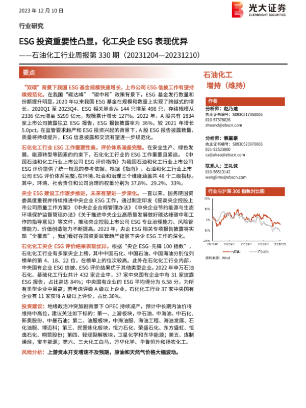 【光大证券】【20231210】20231210-光大证券-石油化工行业周报第330期:ESG投资重要性凸显,化工央企ESG表现优异-20页