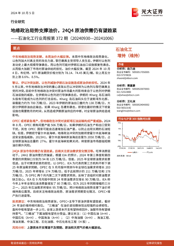 【光大证券】【20241005】20241005-光大证券-石油化工行业周报第372期:地缘政治局势支撑油价,24Q4原油供需仍有望趋紧-15页