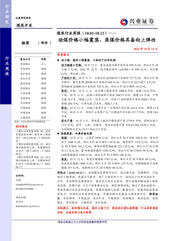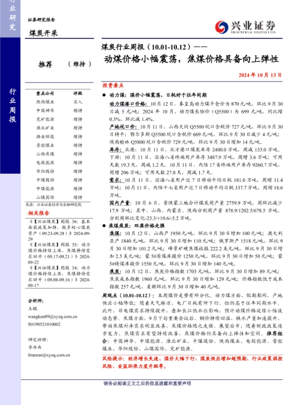 【兴业证券】【20241013】煤炭行业周报(10.01-10.12)——动煤价格小幅震荡,焦煤价格具备向上弹性-13页