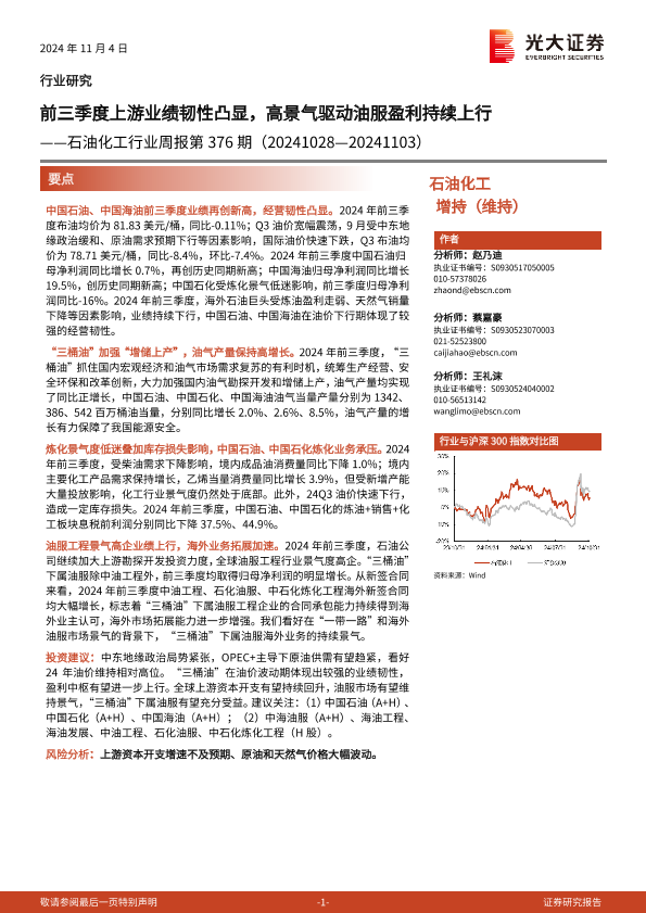 【光大证券】【20241104】20241104-光大证券-石油化工行业周报第376期:前三季度上游业绩韧性凸显,高景气驱动油服盈利持续上行-16页