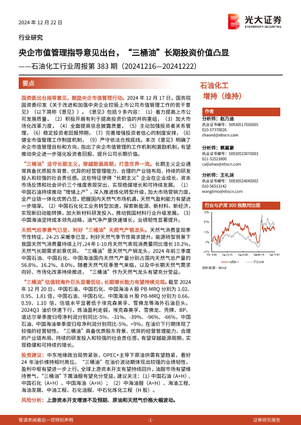 【光大证券】【20241222】石油化工行业周报第383期:央企市值管理指导意见出台,“三桶油”长期投资价值凸显-12页