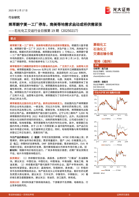 【光大证券】【20250217】20250217-光大证券-石化化工交运行业日报第19期:烯草酮宁夏一工厂停车,南美等地需求启动或将供需紧张-11页