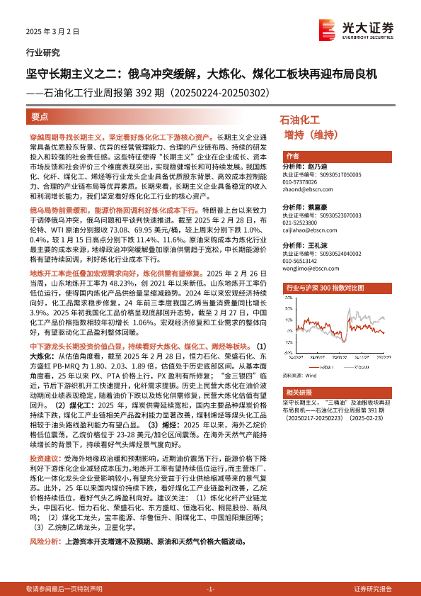 【光大证券】【20250302】20250302-光大证券-石油化工行业周报第392期:坚守长期主义之二,俄乌冲突缓解,大炼化、煤化工板块再迎布局良机-18页