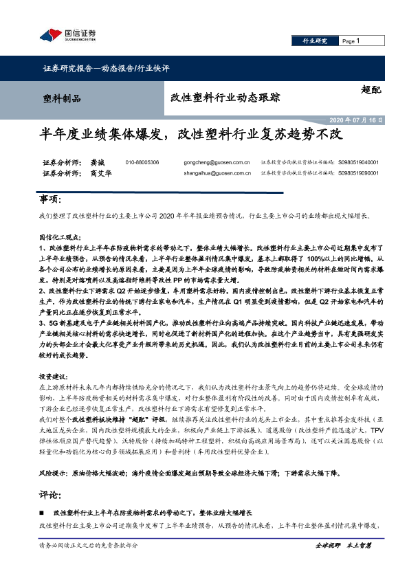 【国信证券】【20200716】20200716-国信证券-改性塑料行业动态跟踪:半年度业绩集体爆发,改性塑料行业复苏趋势不改-8页