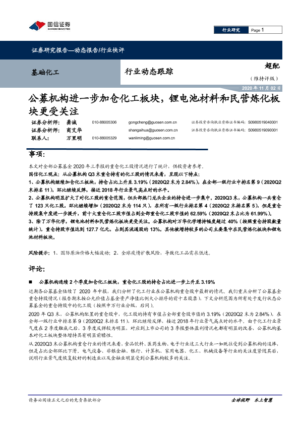 【国信证券】【20201102】基础化工行业动态跟踪:公募机构进一步加仓化工板块,锂电池材料和民营炼化板块更受关注-8页