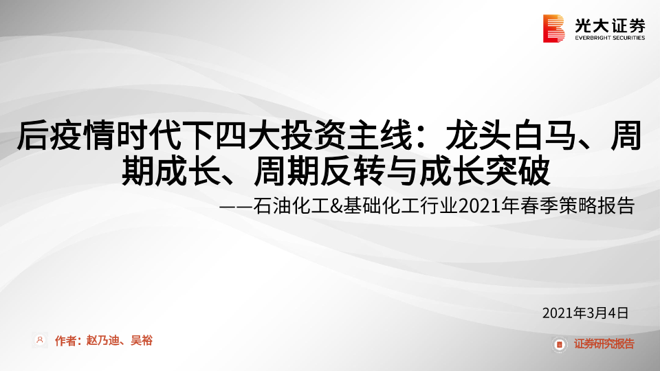 【光大证券】【20210304】石油化工&基础化工行业2021年春季策略报告:后疫情时代下四大投资主线:龙头白马、周期成长、周期反转与成长突破-48页