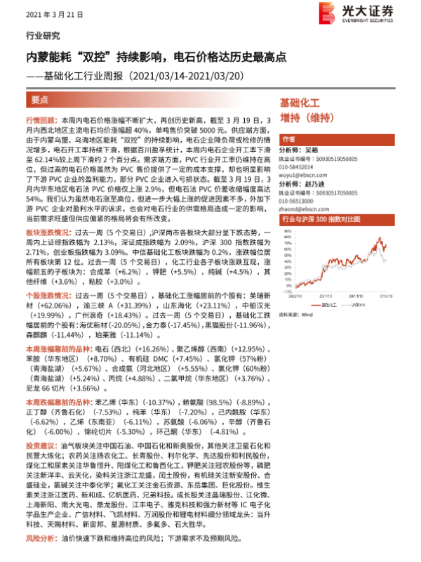 【光大证券】【20210321】基础化工行业周报:内蒙能耗“双控”持续影响,电石价格达历史最高点-21页