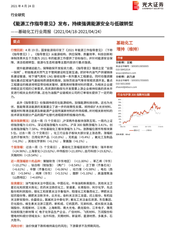 【光大证券】【20210424】20210424-光大证券-基础化工行业周报:《能源工作指导意见》发布,持续强调能源安全与低碳转型-21页