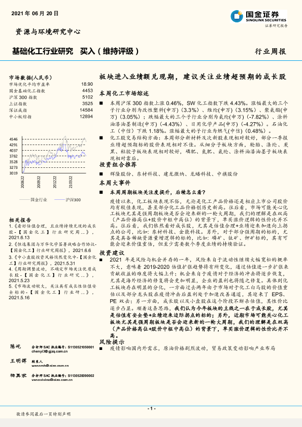 【国金证券】【20210620】基础化工行业周报:板块进入业绩额兑现期,建议关注业绩超预期的成长股-18页