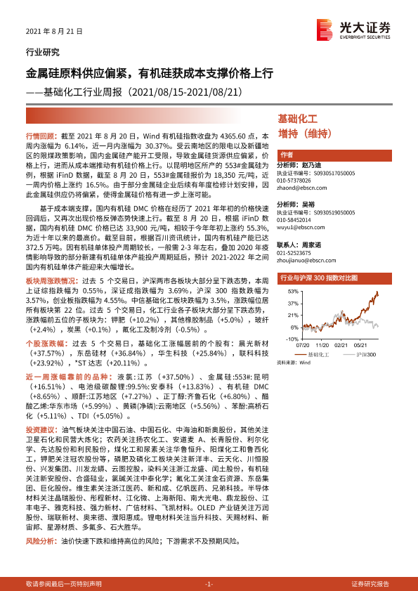 【光大证券】【20210821】基础化工行业周报:金属硅原料供应偏紧,有机硅获成本支撑价格上行-24页