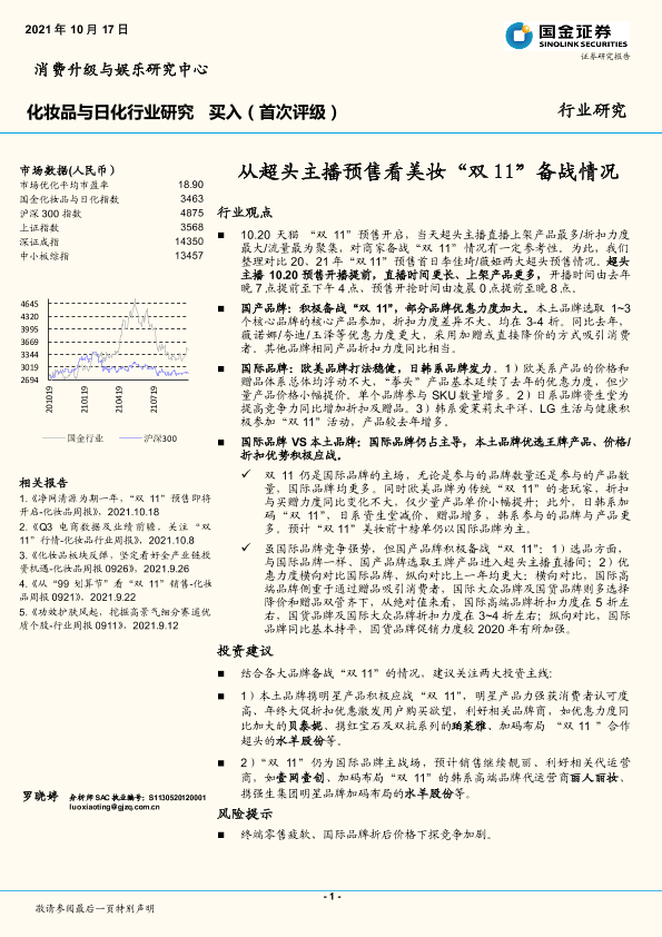 【国金证券】【20211017】化妆品与日化行业研究:从超头主播预售看美妆“双11”备战情况-9页