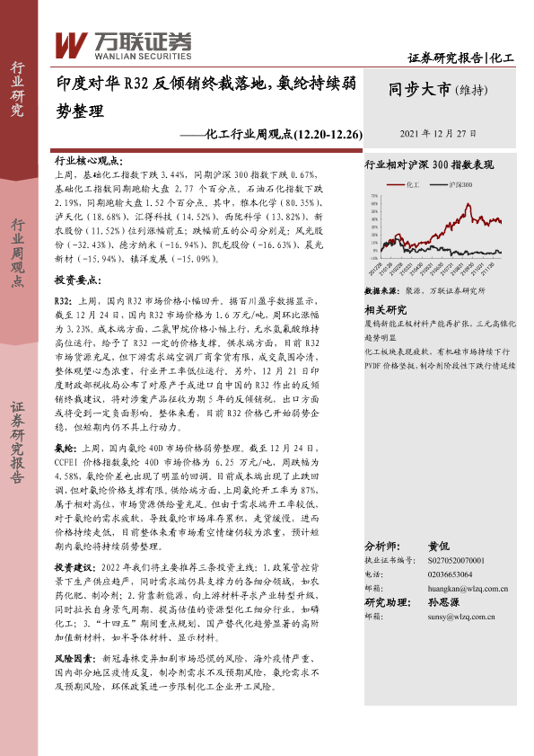 【万联证券】【20211227】20211227-万联证券-化工行业周观点:印度对华R32反倾销终裁落地,氨纶持续弱势整理-11页