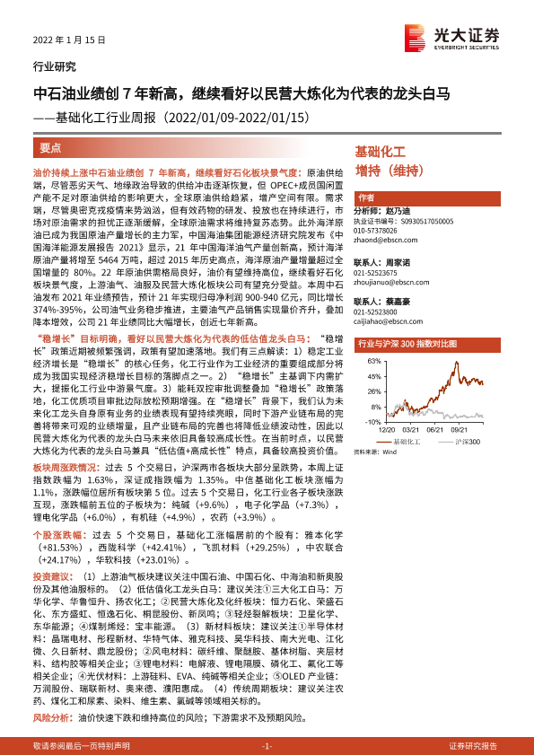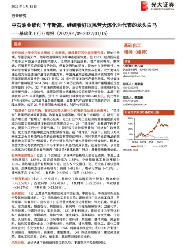【光大证券】【20220115】基础化工行业周报:中石油业绩创7年新高,继续看好以民营大炼化为代表的龙头白马-26页
