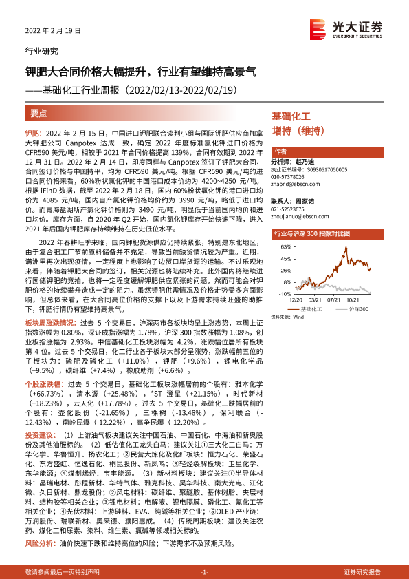 【光大证券】【20220219】基础化工行业周报:钾肥大合同价格大幅提升,行业有望维持高景气-23页