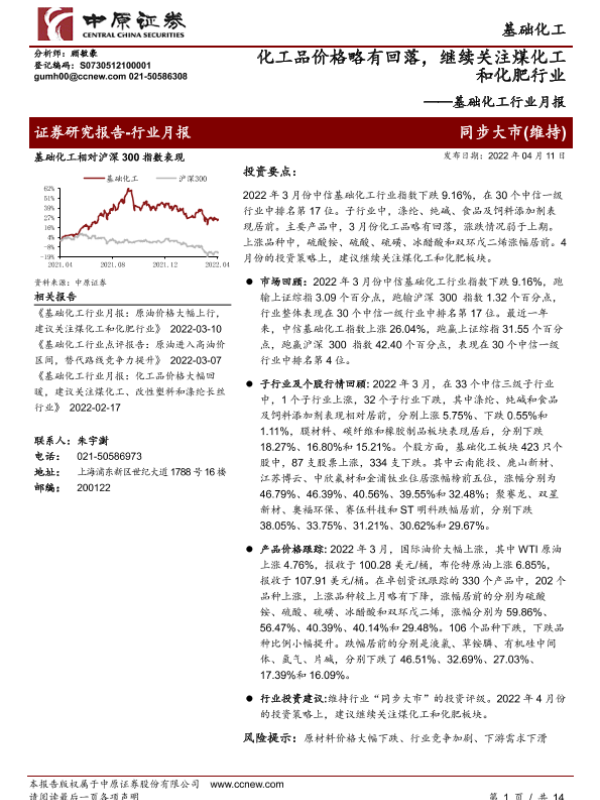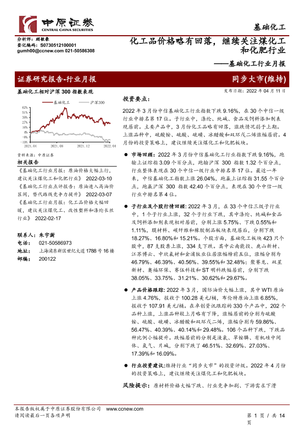 【中原证券】【20220411】基础化工行业月报:化工品价格略有回落,继续关注煤化工和化肥行业-14页