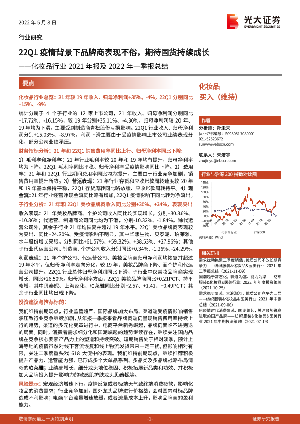 【光大证券】【20220508】化妆品行业2021年报及2022年一季报总结:22Q1疫情背景下品牌商表现不俗,期待国货持续成长-12页