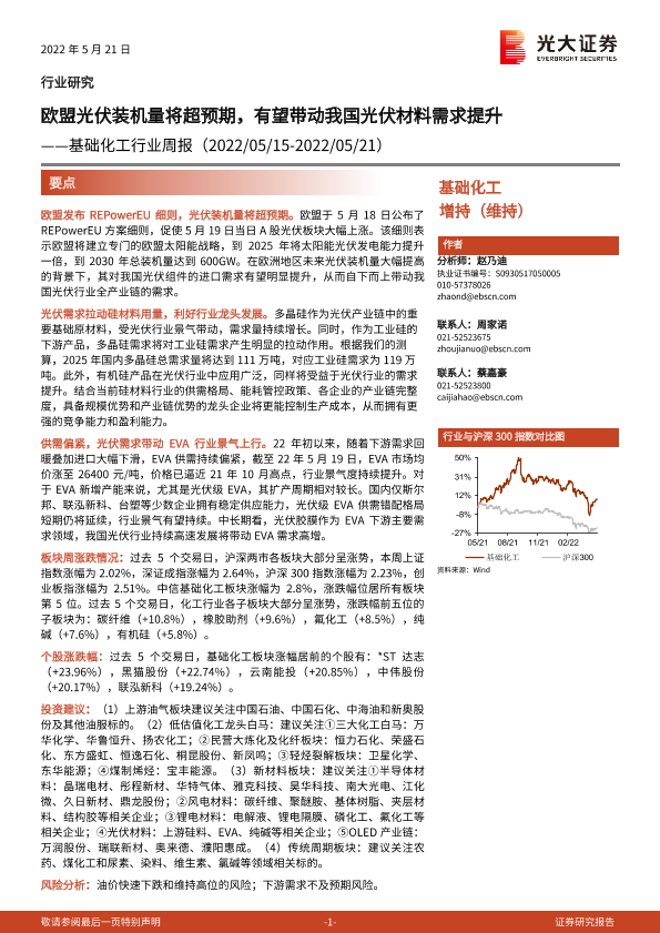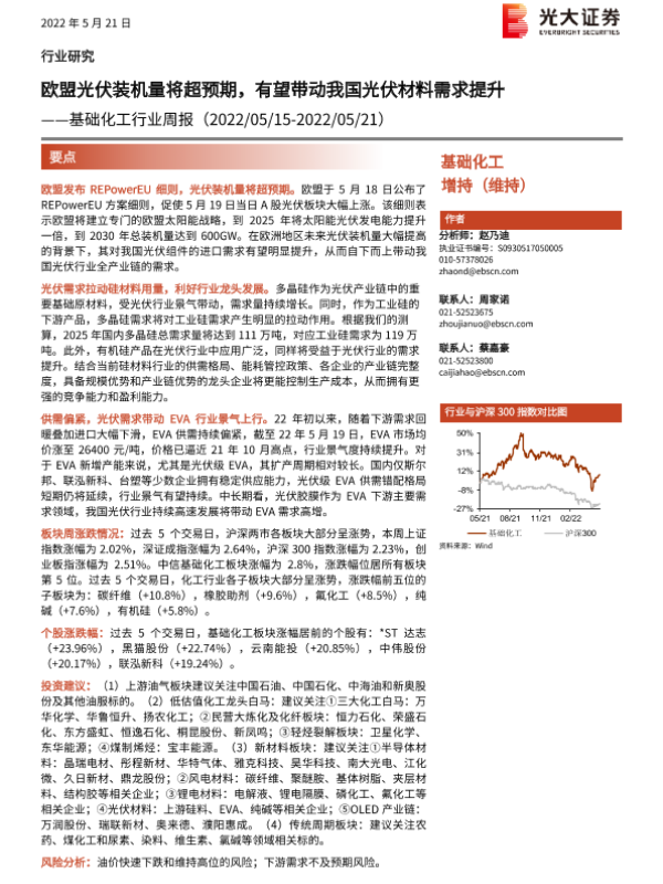 【光大证券】【20220521】基础化工行业周报:欧盟光伏装机量将超预期,有望带动我国光伏材料需求提升-31页
