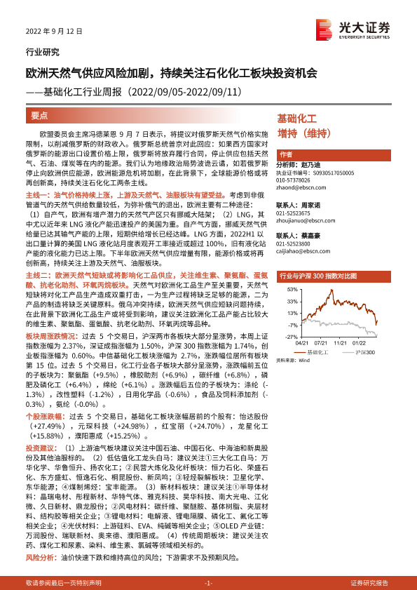【光大证券】【20220912】基础化工行业周报:欧洲天然气供应风险加剧,持续关注石化化工板块投资机会-30页