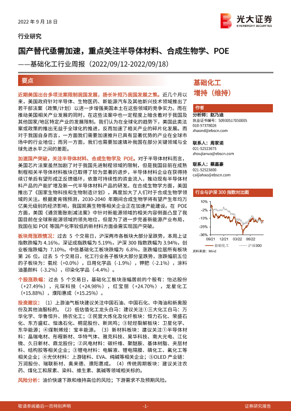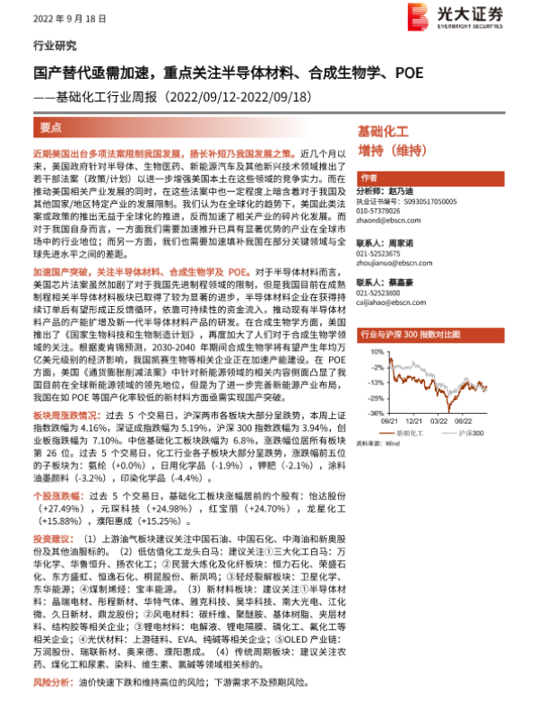 【光大证券】【20220918】基础化工行业周报:国产替代亟需加速,重点关注半导体材料、合成生物学、POE-24页