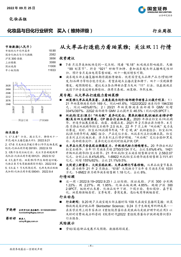【国金证券】【20220925】20220925-国金证券-化妆品与日化行业研究:从大单品打造能力看珀莱雅;关注双11行情-12页