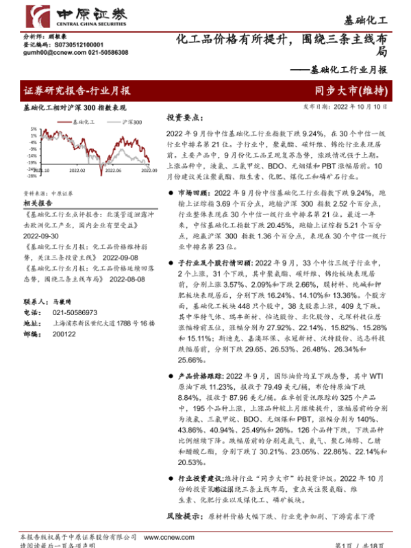 【中原证券】【20221010】基础化工行业月报:化工品价格有所提升,围绕三条主线布局-18页