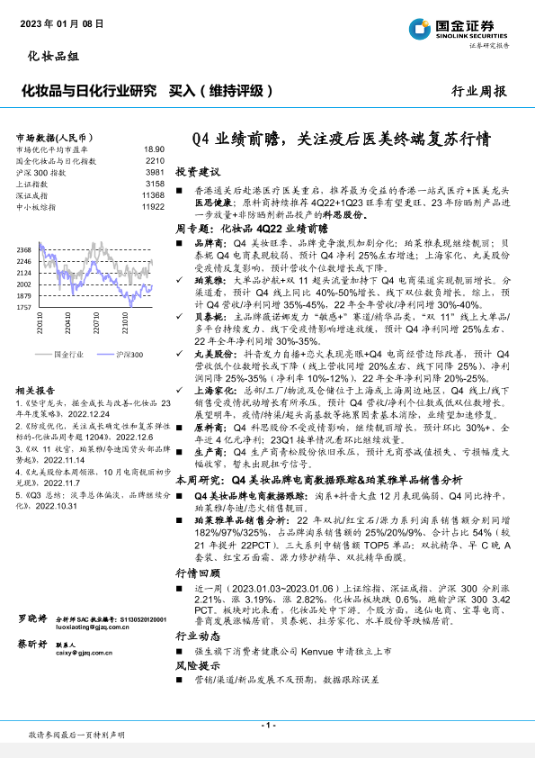 【国金证券】【20230108】20230108-国金证券-化妆品与日化行业研究:Q4业绩前瞻,关注疫后医美终端复苏行情-16页