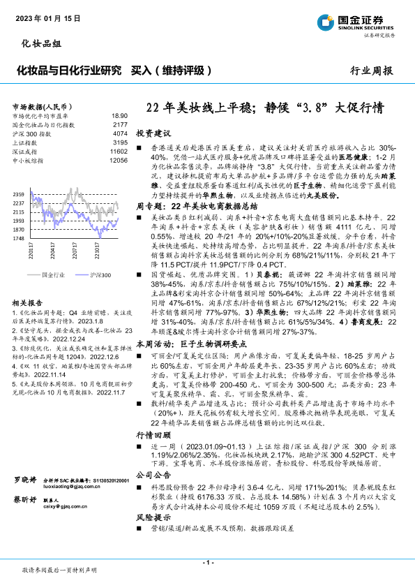 【国金证券】【20230115】20230115-国金证券-化妆品与日化行业研究:22年美妆线上平稳;静候“3.8”大促行情-12页