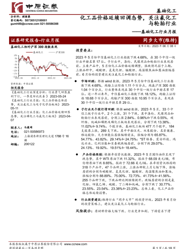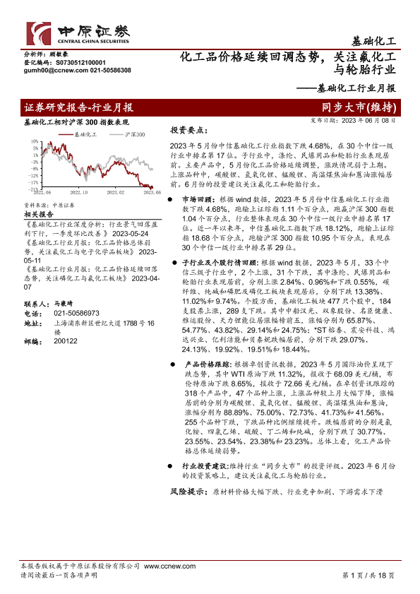 【中原证券】【20230608】基础化工行业月报:化工品价格延续回调态势,关注氟化工与轮胎行业-18页
