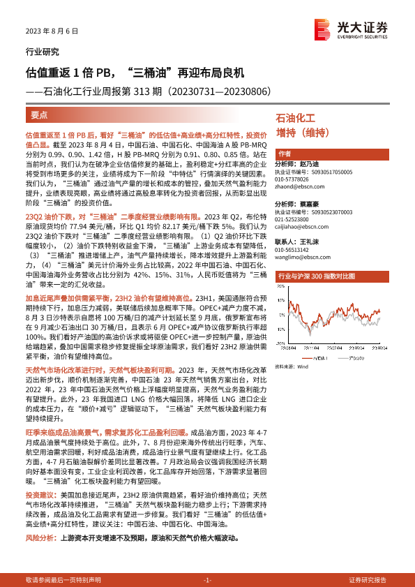 【光大证券】【20230806】20230806-光大证券-石油化工行业周报第313期:估值重返1倍PB,“三桶油”再迎布局良机-28页