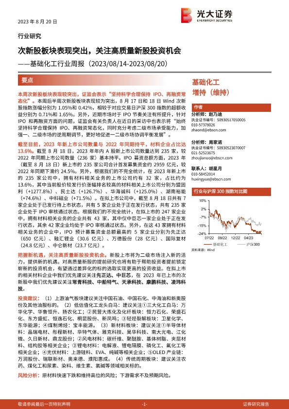 【光大证券】【20230820】基础化工行业周报:次新股板块表现突出,关注高质量新股投资机会-43页