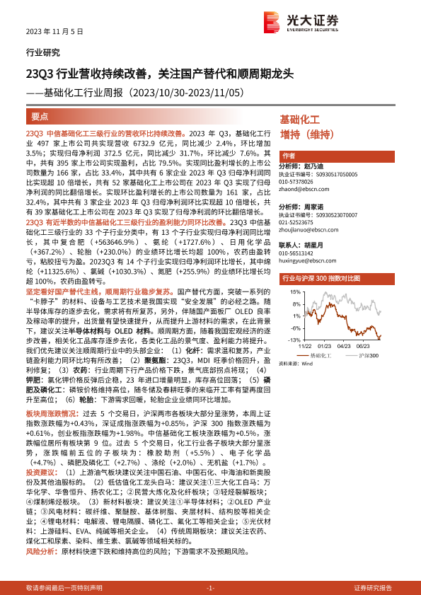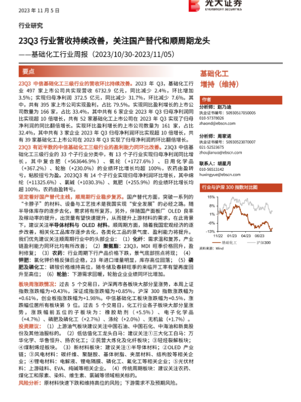 【光大证券】【20231105】20231105-光大证券-基础化工行业周报:23Q3行业营收持续改善,关注国产替代和顺周期龙头-36页