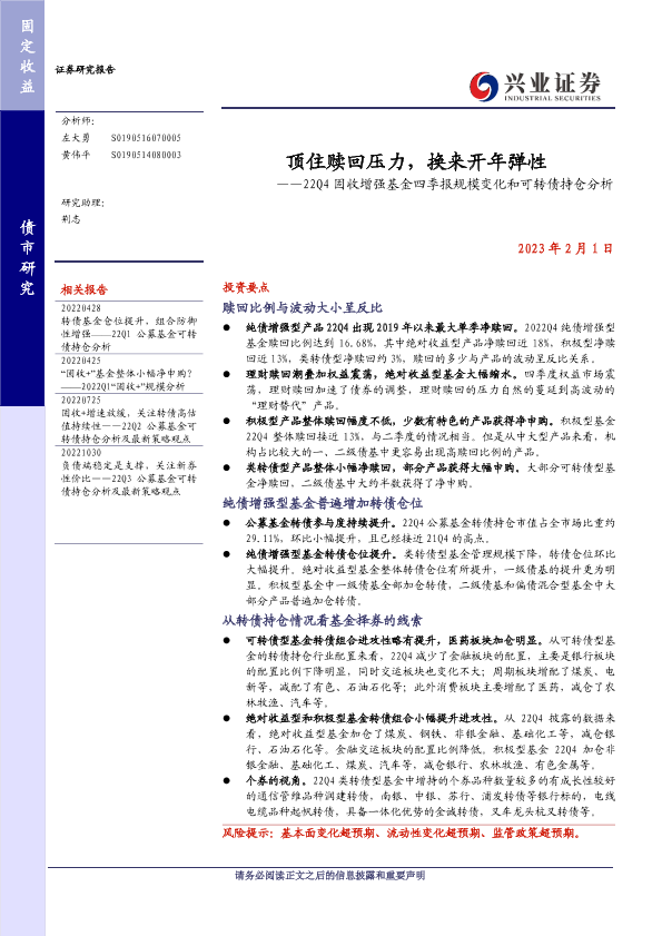 【兴业证券】【20230201】22Q4固收增强基金四季报规模变化和可转债持仓分析:顶住赎回压力,换来开年弹性-22页