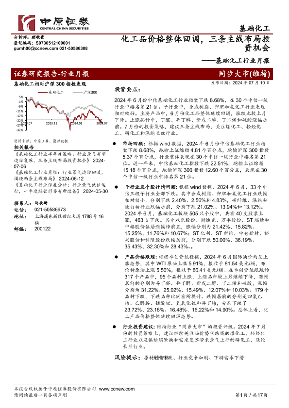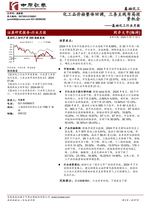 【中原证券】【20240710】基础化工行业月报:化工品价格整体回调,三条主线布局投资机会-17页