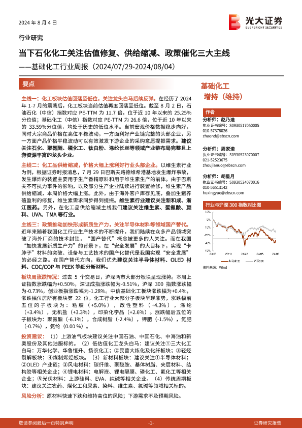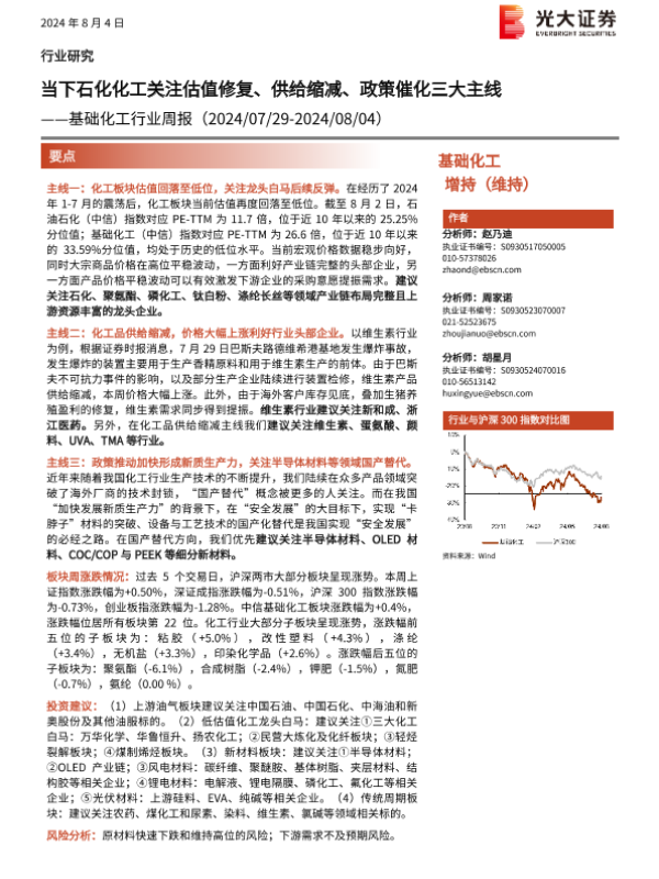 【光大证券】【20240804】20240804-光大证券-基础化工行业周报:当下石化化工关注估值修复、供给缩减、政策催化三大主线-27页
