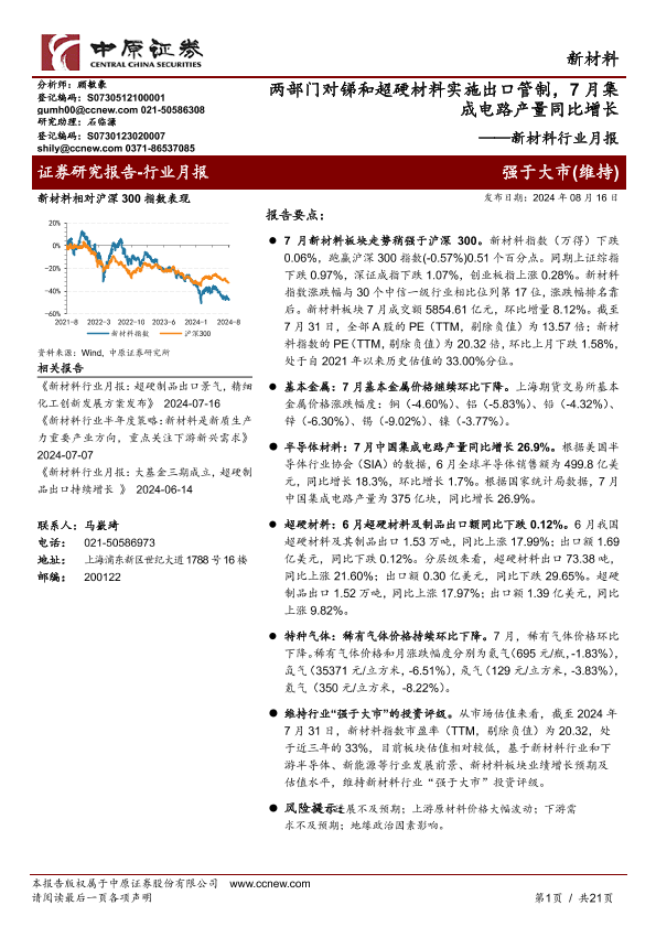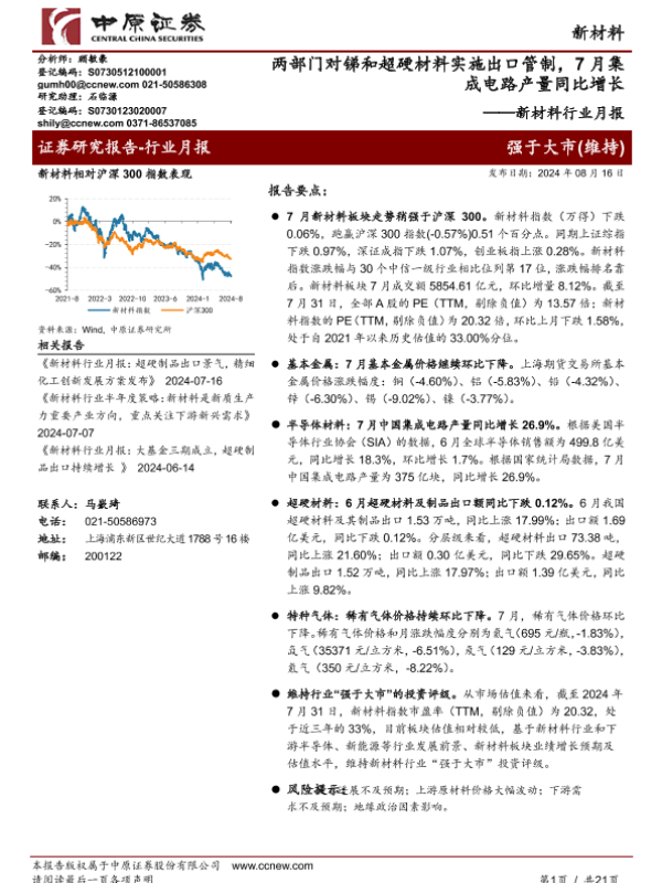【中原证券】【20240816】新材料行业月报:两部门对锑和超硬材料实施出口管制,7月集成电路产量同比增长-21页