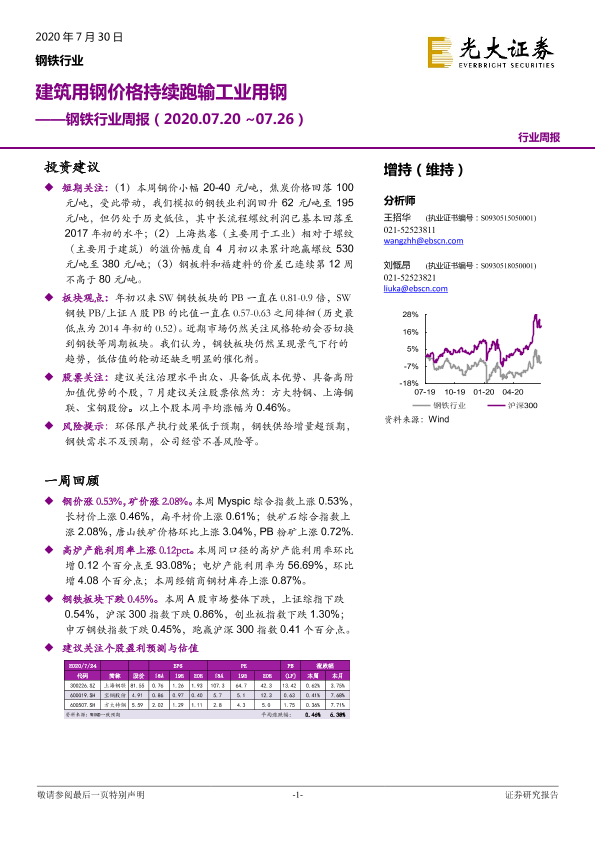 【光大证券】【20200730】钢铁行业周报:建筑用钢价格持续跑输工业用钢-8页