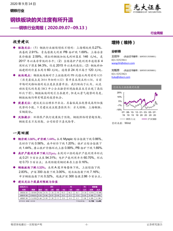 【光大证券】【20200914】钢铁行业周报:钢铁板块的关注度有所升温-8页