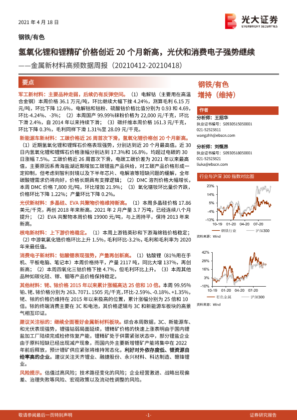 【光大证券】【20210418】20210418-光大证券-金属新材料高频数据周报:氢氧化锂和锂精矿价格创近20个月新高,光伏和消费电子强势继续-26页