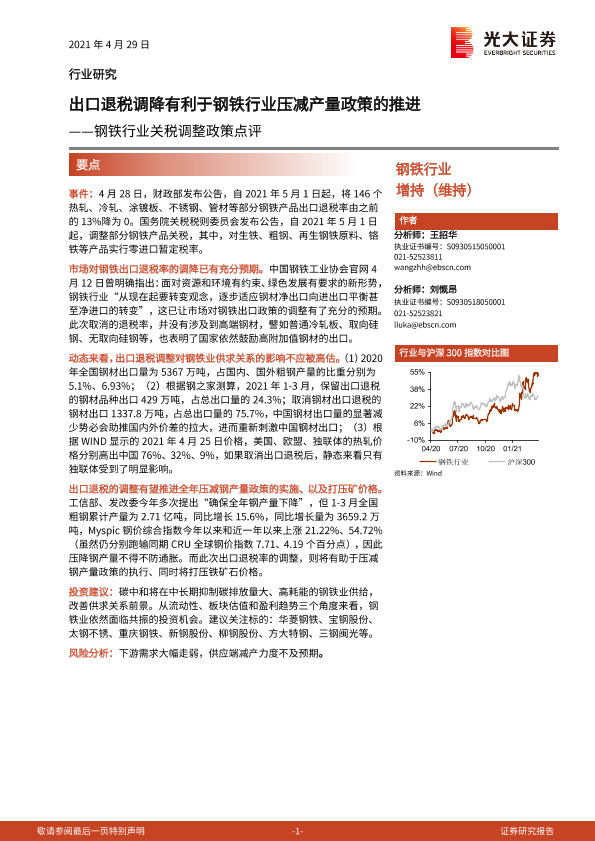 【光大证券】【20210429】钢铁行业关税调整政策点评:出口退税调降有利于钢铁行业压减产量政策的推进-2页