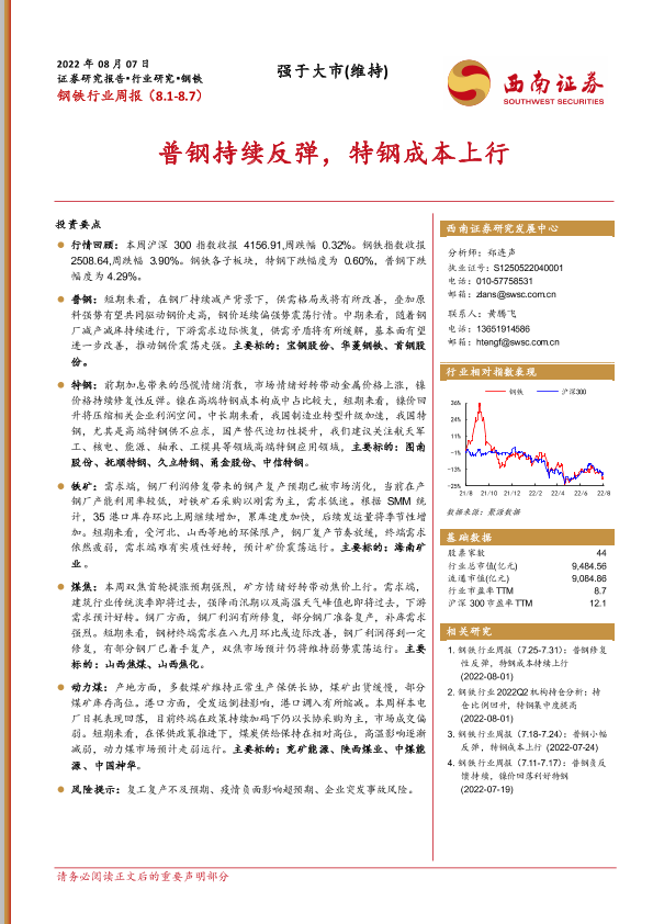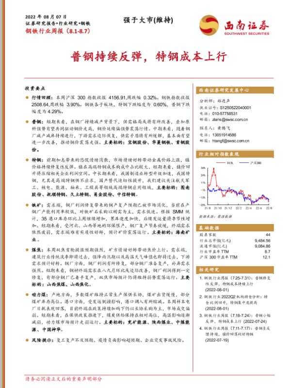 【西南证券】【20220807】20220807-西南证券-钢铁行业周报:普钢持续反弹,特钢成本上行-16页