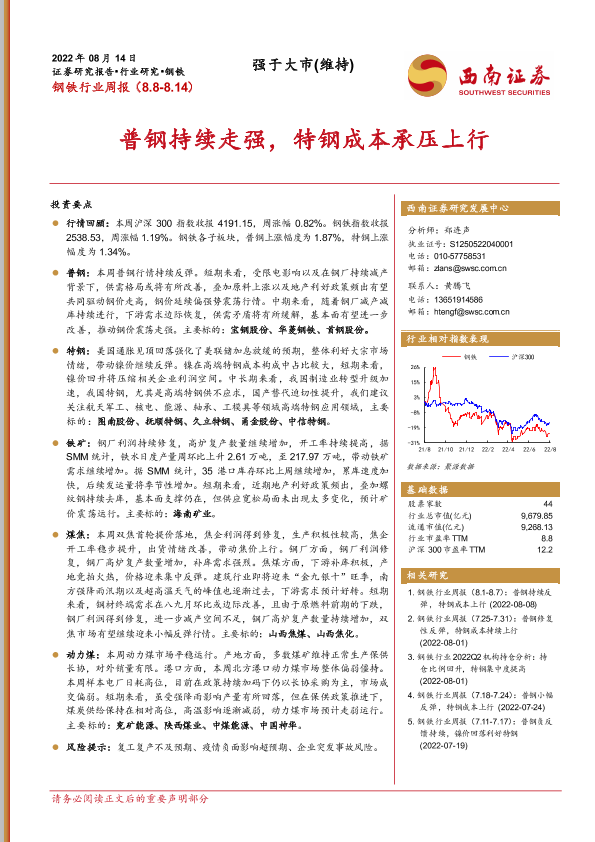 【西南证券】【20220814】20220814-西南证券-钢铁行业周报:普钢持续走强,特钢成本承压上行-16页