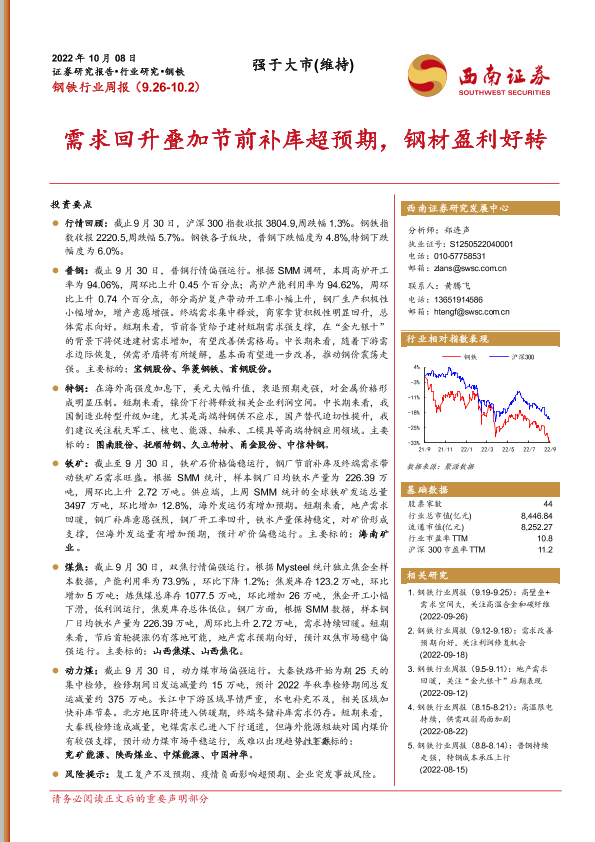 【西南证券】【20221008】20221008-西南证券-钢铁行业周报:需求回升叠加节前补库超预期,钢材盈利好转-16页