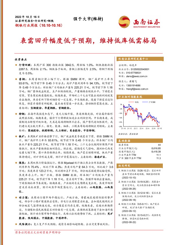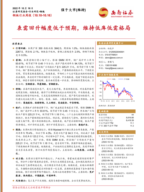 【西南证券】【20221016】20221016-西南证券-钢铁行业周报:表需回升幅度低于预期,维持低库低需格局-16页