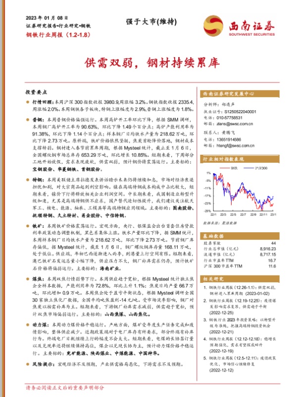【西南证券】【20230108】20230108-西南证券-钢铁行业周报:供需双弱,钢材持续累库-16页