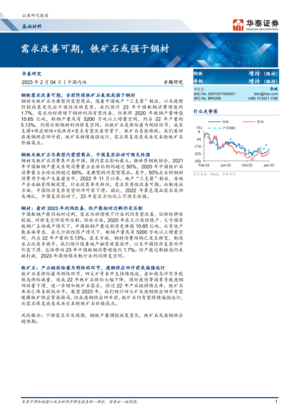 【华泰证券】【20230204】20230204-华泰证券-基础材料专题研究:需求改善可期,铁矿石或强于钢材-10页