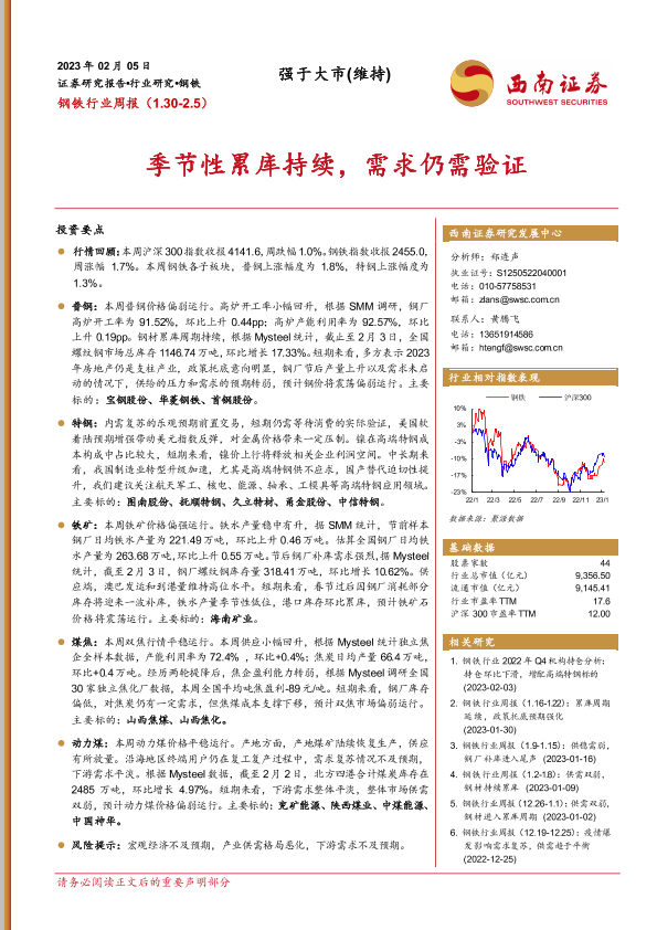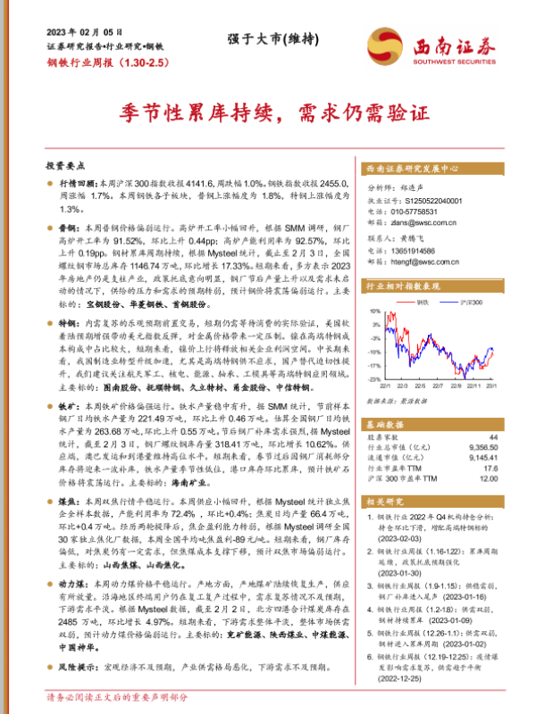 【西南证券】【20230205】20230205-西南证券-钢铁行业周报:季节性累库持续,需求仍需验证-16页