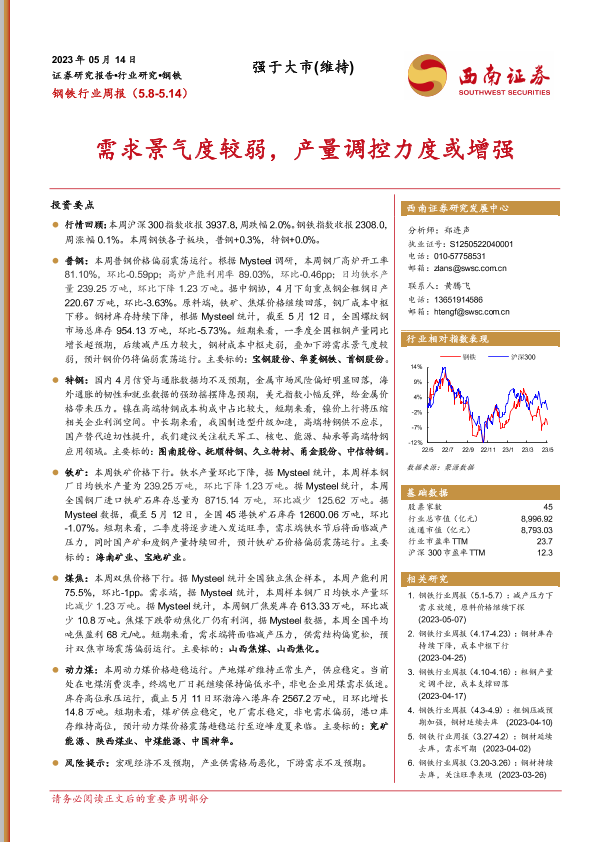 【西南证券】【20230515】20230515-西南证券-钢铁行业周报:需求景气度较弱,产量调控力度或增强-16页