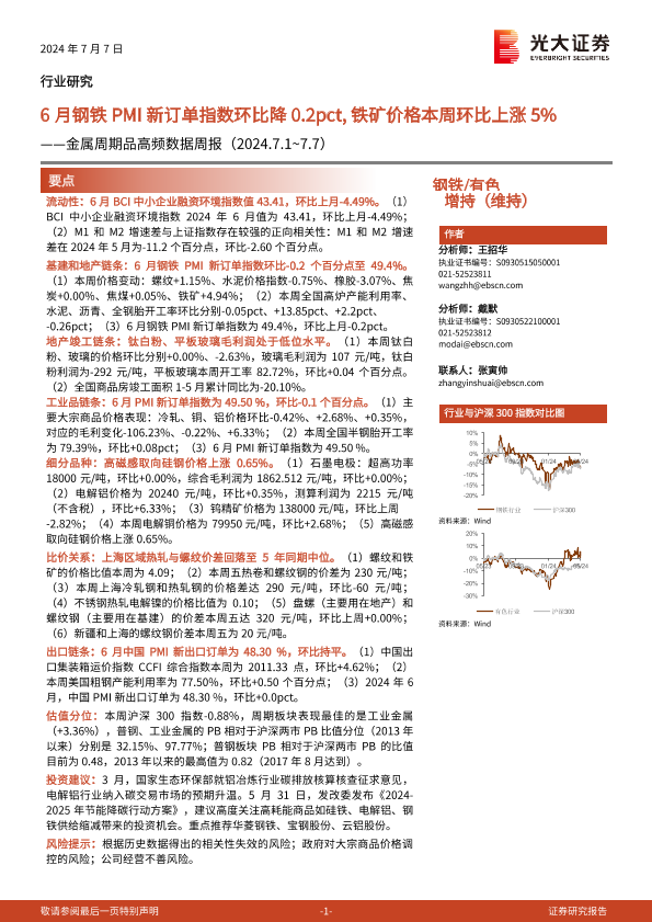 【光大证券】【20240707】20240707-光大证券-钢铁 有色行业金属周期品高频数据周报:6月钢铁PMI新订单指数环比降0.2pct,铁矿价格本周环比上涨5%-27页
