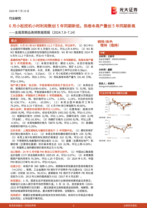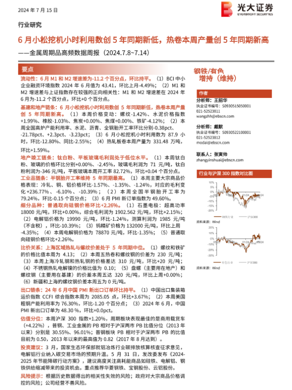 【光大证券】【20240715】20240715-光大证券-钢铁 有色行业金属周期品高频数据周报:6月小松挖机小时利用数创5年同期新低,热卷本周产量创5年同期新高-28页